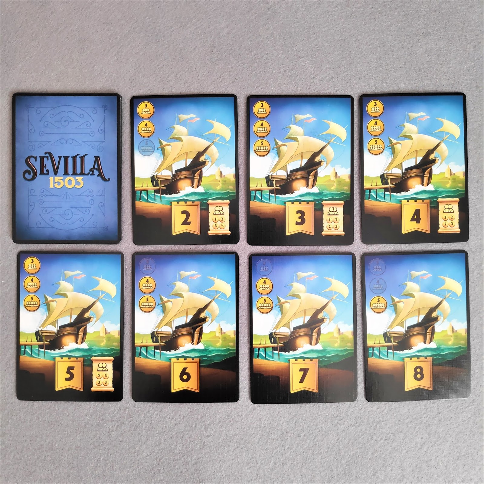 12 Cartas de barco: Estas cartas se obtienen en la fase de subastas y son muy importantes porque su número nos indica el espacio que tenemos para embarcar las cartas que hemos ganado en las subastas. Se usarán unas u otras según el número de jugadores y los barcos pueden tener desde 2 hasta 8 espacios.